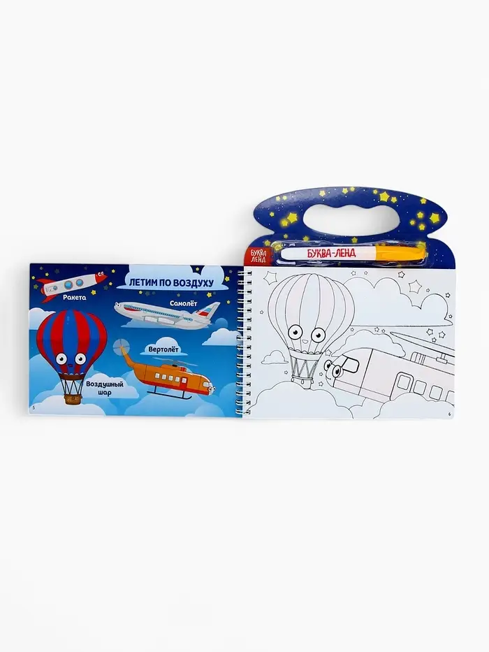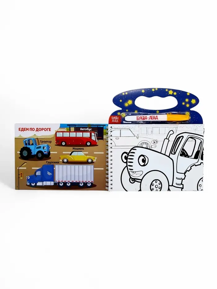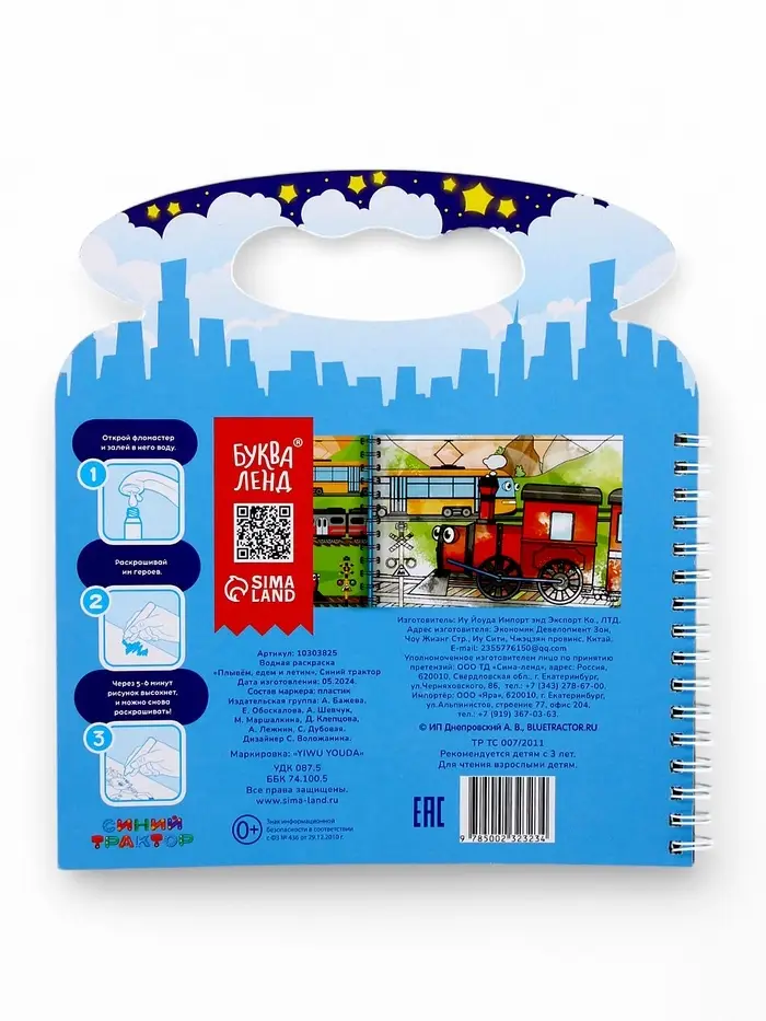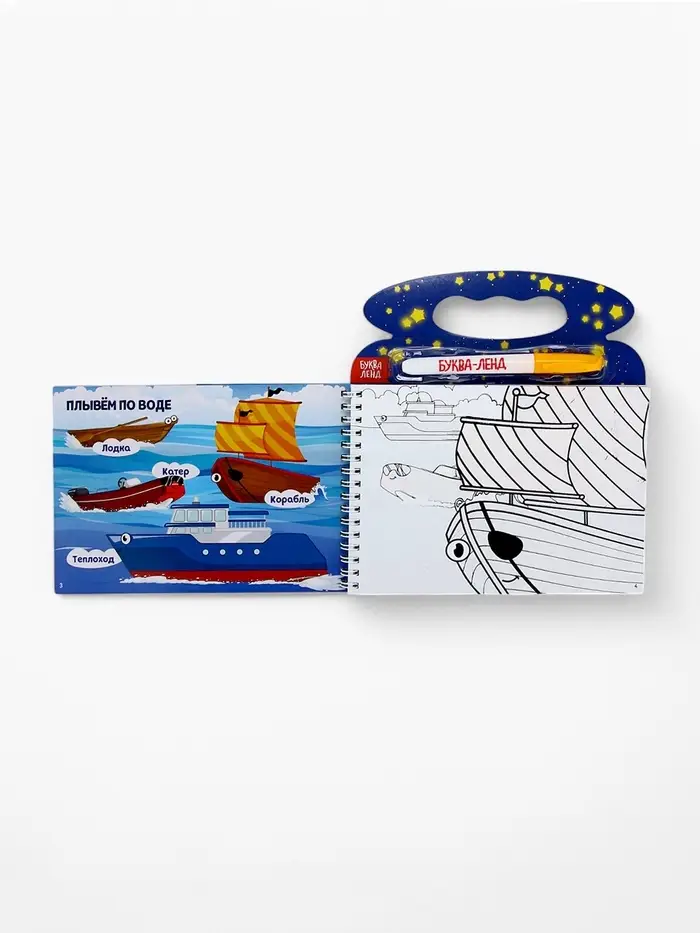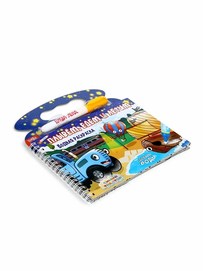 Многоразовая водная раскраска «Плывём, едем и летим» с Синим трактором — это увлекательное занятие для детей, где каждая картинка оживает с помощью воды. В комплект входит маркер, а четыре изображения с видами транспорта можно раскрашивать снова и снова.
