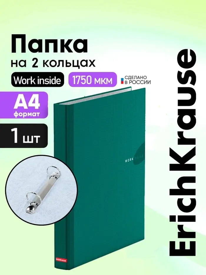 Папка на 2 кольцах А4, ErichKrause Work Inside, 35 мм, 1750 мкм, ламинированная, твердая обложка, зеленая