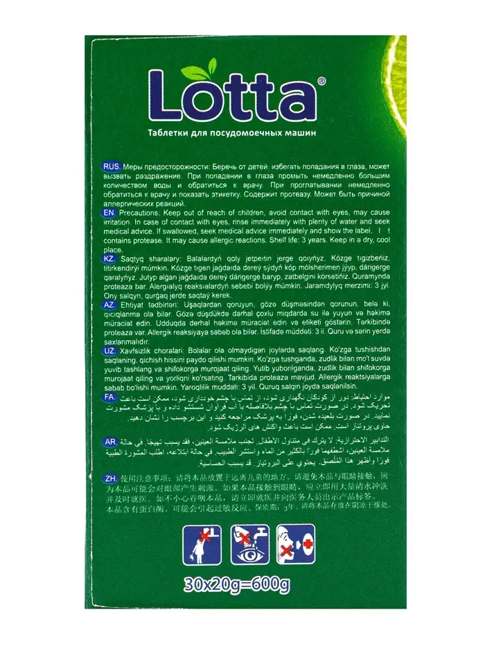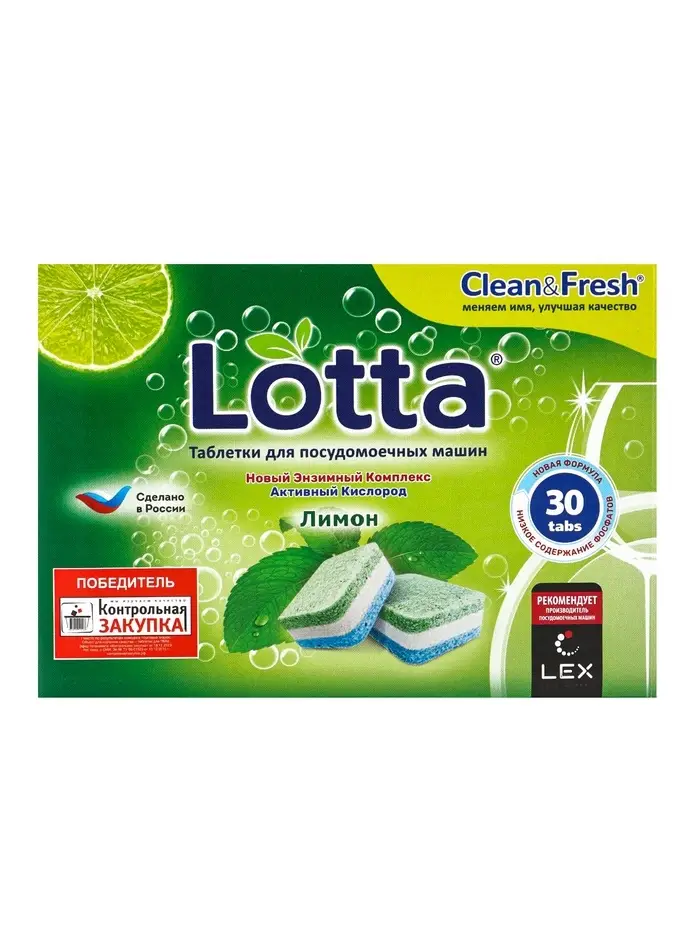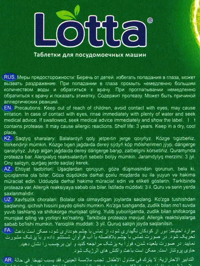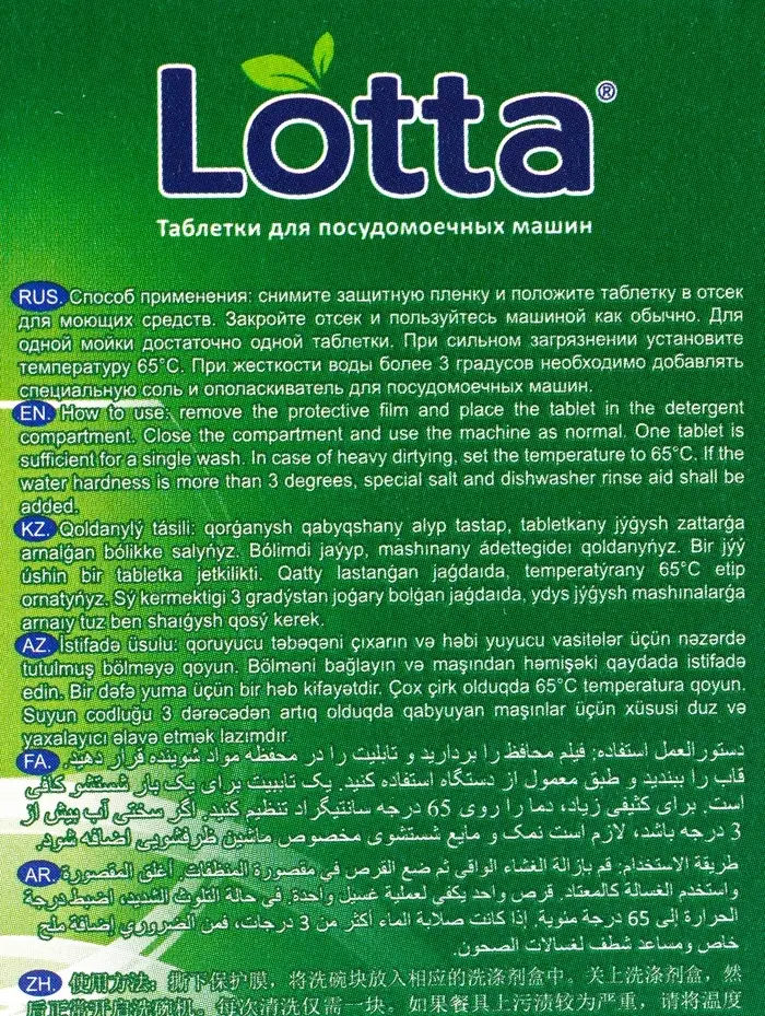 Состав таблеток: триполифосфат натрия — более 30 %; карбонат натрия, бикарбонат натрия — 15-30 %; перкарбонат натрия — 5-15 %; силикат натрия, поликарбоксилаты, неионные ПАВ, ТАЕД, энзимы, фосфонаты, отдушка, краситель — менее 5 %.