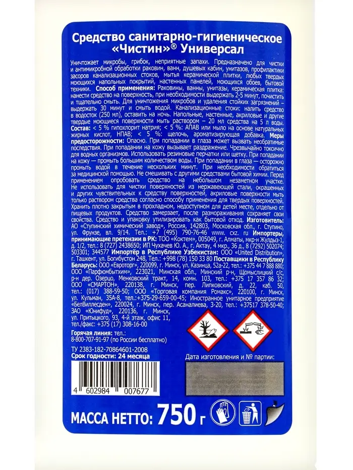 необратимые последствия. При попадании на кожу, промыть большим количеством воды. При попадании в глаза, осторожно промыть водой в течении нескольких минут. Использовать резиновые перчатки или щетку. При необходимости обратиться за медицинской помощью. Не смешивать с другими веществами. Хранить в плотно закрытом и прохладном месте, недоступном для детей, отдельно от пищевых продуктов. Срок годности 18 месяцев с даты изготовления см. на упаковке.