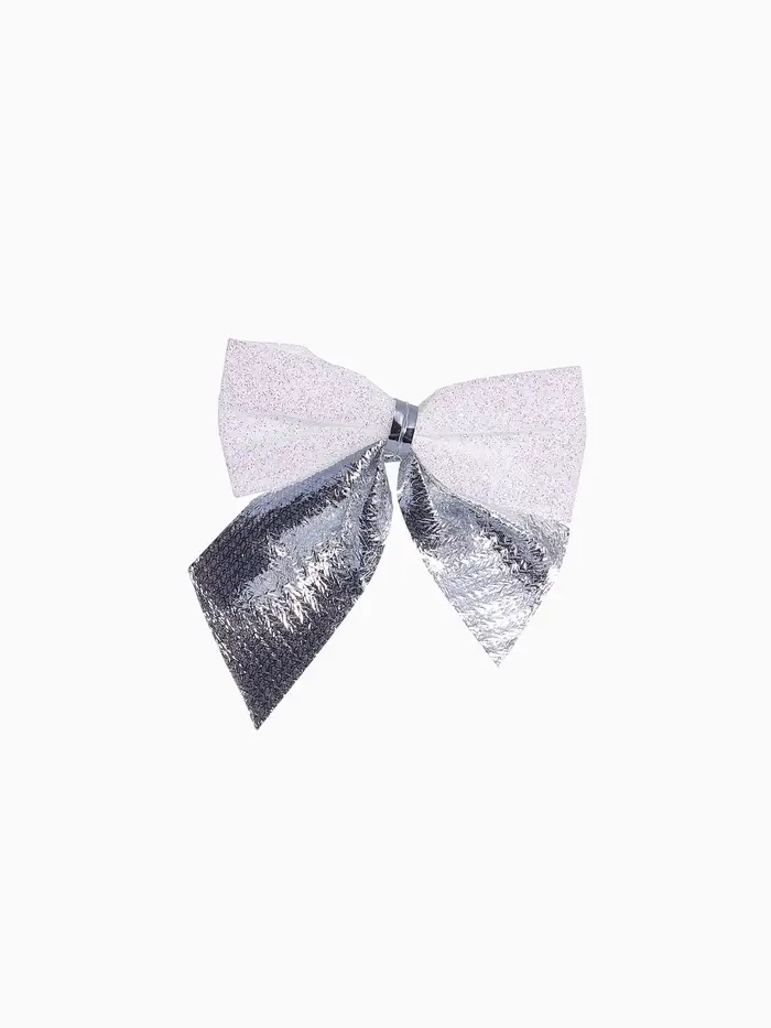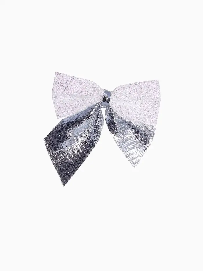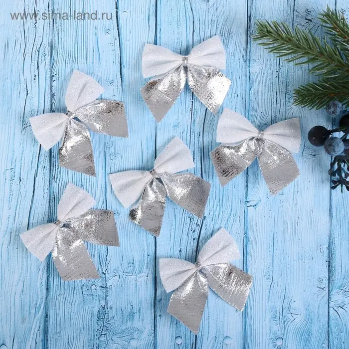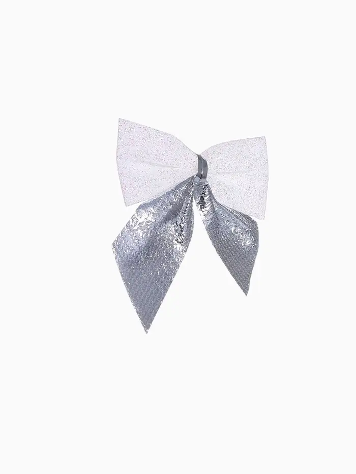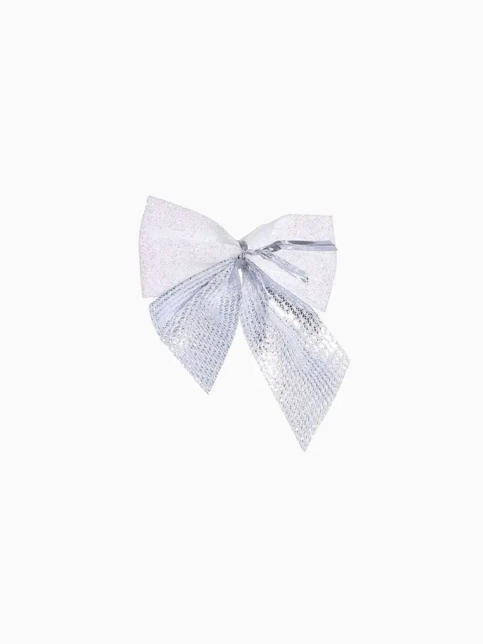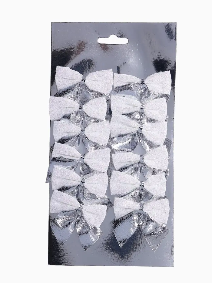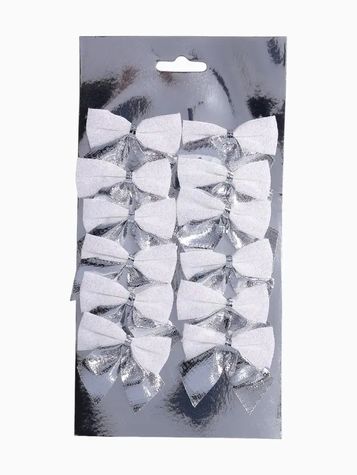Набор из 12 серебристо-белых текстильных бантиков размером около 5,5×5 см подходит для украшения новогодней ёлки и праздничного интерьера. Эти однотонные аксессуары выполнены в классическом и скандинавском стилях с элементами ар-деко, создавая сдержанную и гармоничную атмосферу.