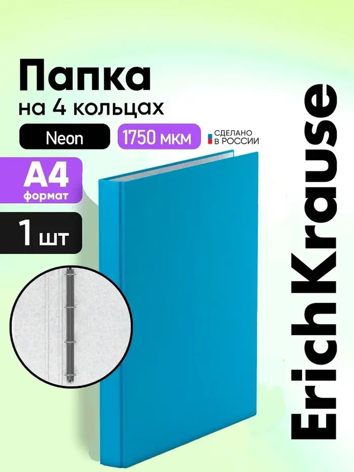 Папка на 4 кольцах А4, ErichKrause Neon, 35 мм, 1750 мкм, ламинированная, твердая обложка, голубая