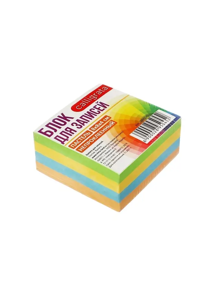 Блок бумаги для записей Calligrata — ваш универсальный помощник в организации рабочего пространства. Плотность 80 г/м² и непроклеенная структура делают его идеальным выбором для офисных будней. Компактные размеры 8x8x4 см позволяют разместить блок практически где угодно, легко помещается в сумке или рюкзаке. Пастельные оттенки бумаги приятно радуют глаз и поднимают настроение.
