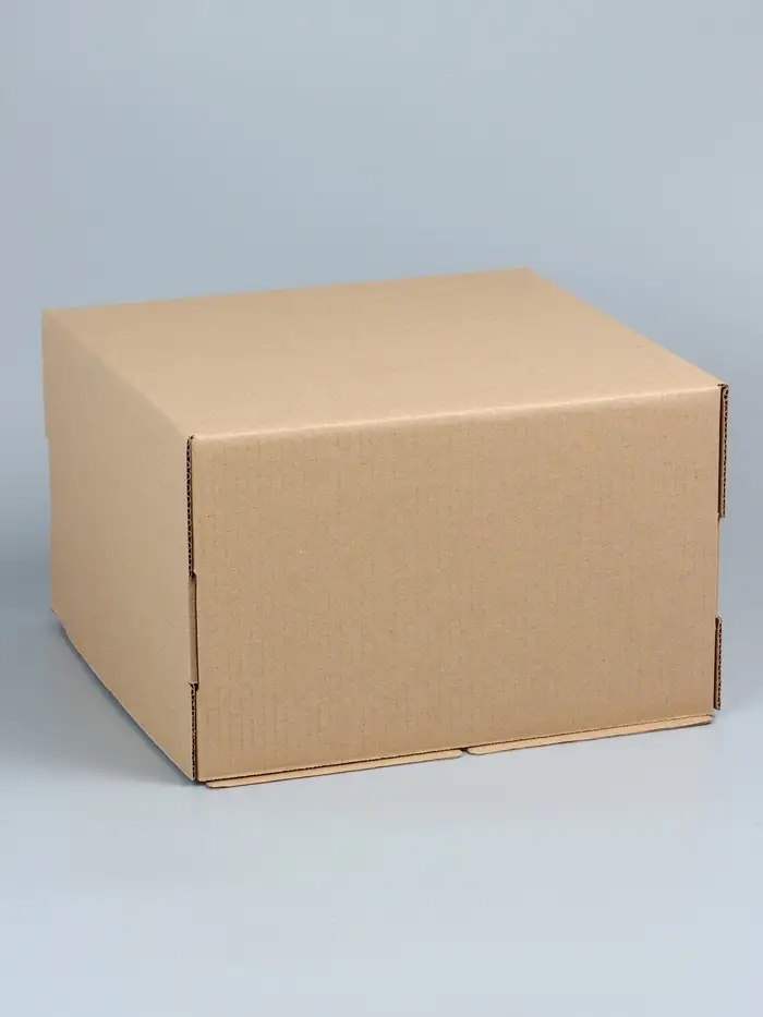 - Прочный крафтовый картон: Изготовлена из плотного небелёного картона, который выдерживает вес до 5 кг. Материал обеспечивает жёсткость стенок и защищает торт от деформации и повреждений при переноске.