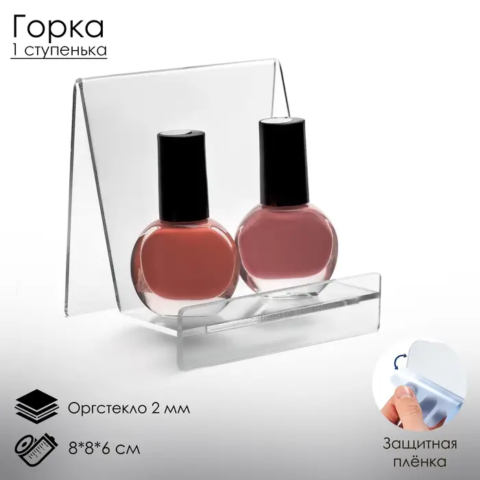 Простая и стильная горка с двумя ступеньками создаёт удобное расположение товаров для демонстрации. Размеры 8×8×6 см подходят для размещения товаров разного размера и формы. Подставки из оргстекла (листовой акрил). Благодаря использованию 100% акрила, подставки имеют идеальную прозрачность, высочайший блеск и шикарный внешний вид. ВНИМАНИЕ: Изделия поставляются в матовой защитной плёнке, белого, синего, зелёного или прозрачного цвета, которую необходимо удалить перед оценкой качества или перед использованием.