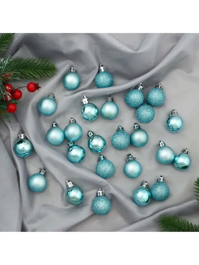 Большой набор из 48 голубых ёлочных шаров диаметром 3 см воплощает стиль шебби-шик в лаконичном однотонном исполнении. Лёгкие пластиковые украшения гармонично дополняют праздничное оформление, создавая нежную и уютную атмосферу.