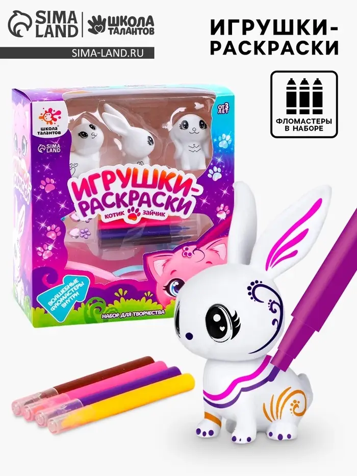 Набор для творчества «Раскрась игрушку» — уникальный продукт, созданный для раскрытия творческого потенциала и развития мелкой моторики у детей. В комплект входят игрушки в виде кошечки и зайчика для раскрашивания и краски, что делает процесс интересным и увлекательным.