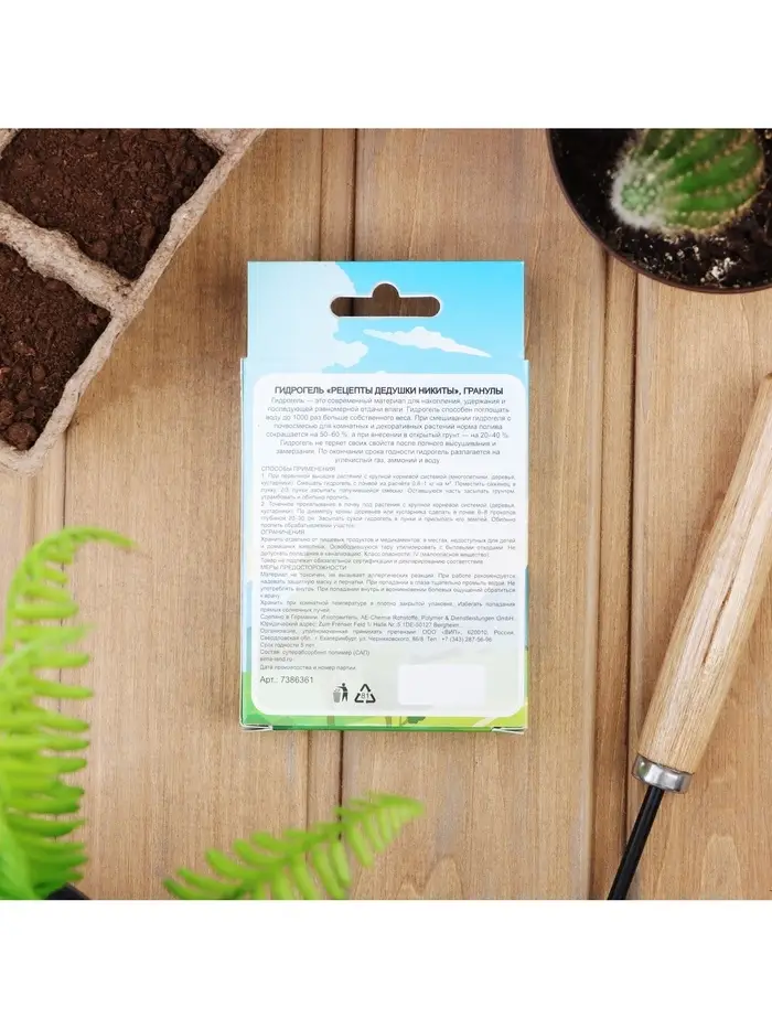 Гидрогель — это современный материал для накопления, удержания и последующей равномерной отдачи влаги. Гидрогель способен поглощать воду до 1000 раз больше собственного веса. При смешивании гидрогеля с почвосмесью для комнатных и декоративных растений норма полива сокращается на 50–60 %, а при внесении в открытый грунт — на 20–40 %. Гидрогель не теряет своих свойств после полного высушивания и замерзания. По окончании срока годности гидрогель разлагается на углекислый газ, аммоний и воду.