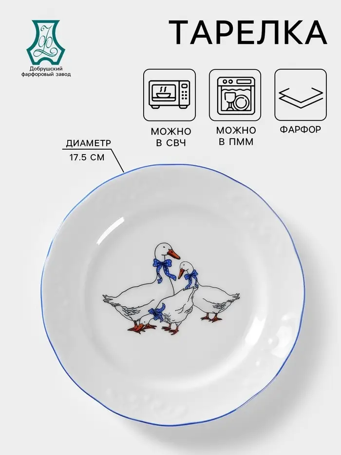 Тарелка Добрушский завод «Гуси», d=17.5 см, фарфор, белая, рисунок МИКС