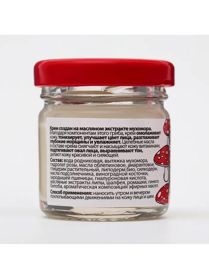 Крем создан на масляном экстракте мухомора. Благодаря компонентам этого гриба, крем омолаживает кожу, тонизирует, улучшает цвет лица, разглаживает глубокие морщины и увлажняет. Целебные масла в составе крема смягчают и насыщают кожу витаминами, подтягивают овал лица, выравнивают тон, делают кожу красивой и сияющей.