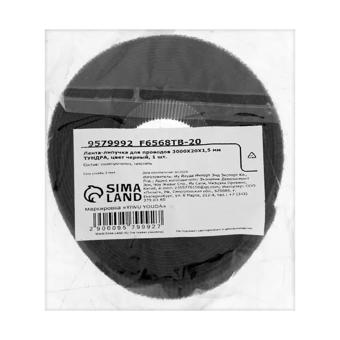 Лента-липучка для проводов 3000×20×1.5 мм ТУНДРА, чёрная, 1 шт.