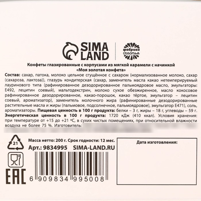 Состав: сахар, патока, молоко цельное сгущённое с сахаром (нормализованное молоко, сахар (сахароза, лактоза)), глазурь кондитерская (сахар, заменитель масла какао нетемперируемый лауринового типа (рафинированное дезодорированное пальмоядровое масло, эмульгаторы: Е492, лецитин соевый), мальтодекстрин, молоко сухое обезжиренное, масло кокосовое рафинированное дезодорированное, какао-порошок, какао тёртое, эмульгатор - лецитин соевый, ароматизатор), заменитель молочного жира (рафинированные дезодорированные растительные масла и жиры (пальмовое, подсолнечное пальмоядровое), эмульгатор Е471), соль, ароматизаторы.