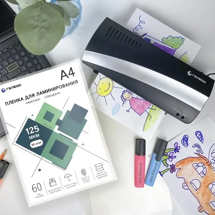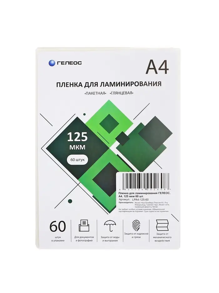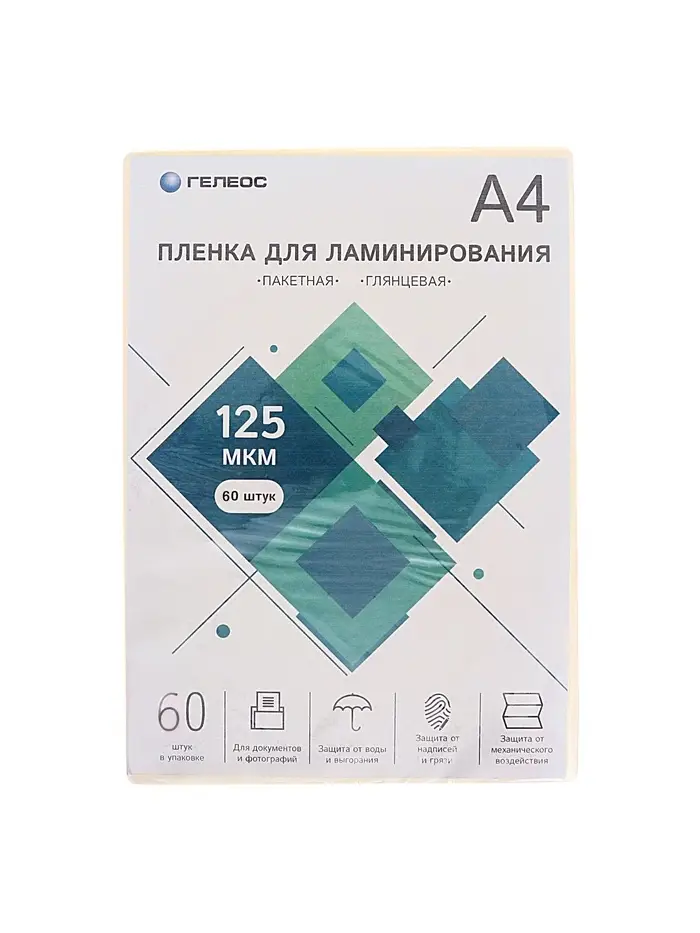 Пленка для ламинирования А4, 125 мкм, 60 штук, глянцевая, Гелеос