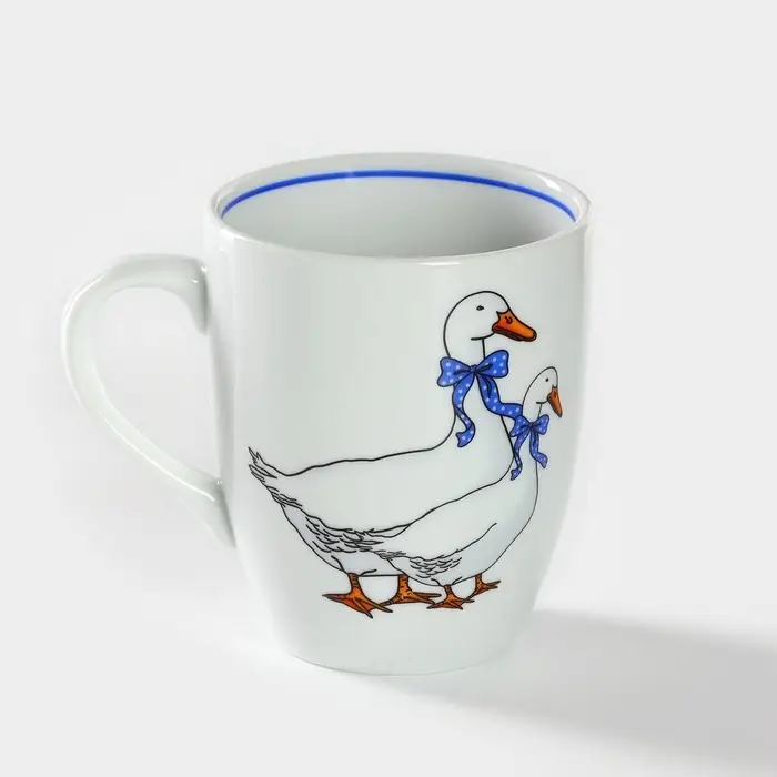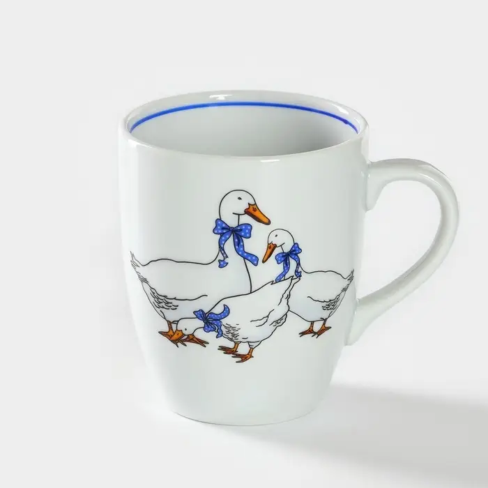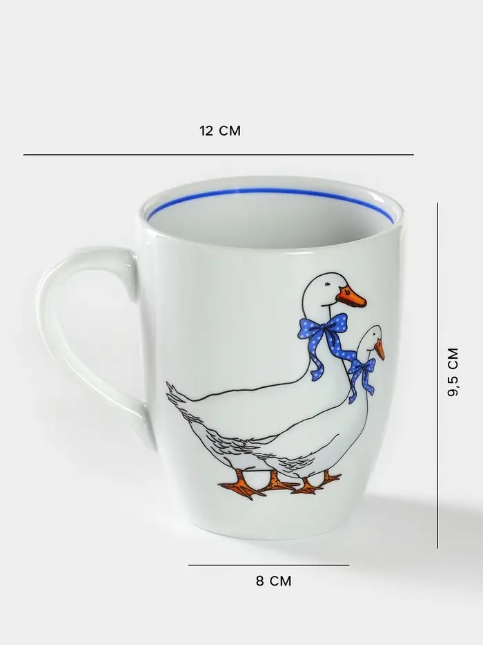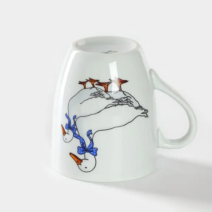 Фарфоровая кружка объёмом 300 мл с изображением гусей — вместительная посуда для ежедневных чаепитий и утреннего кофе. Высота 9,5 см удобна для захвата, а классическая цилиндрическая форма с плавными контурами комфортно лежит в руке.