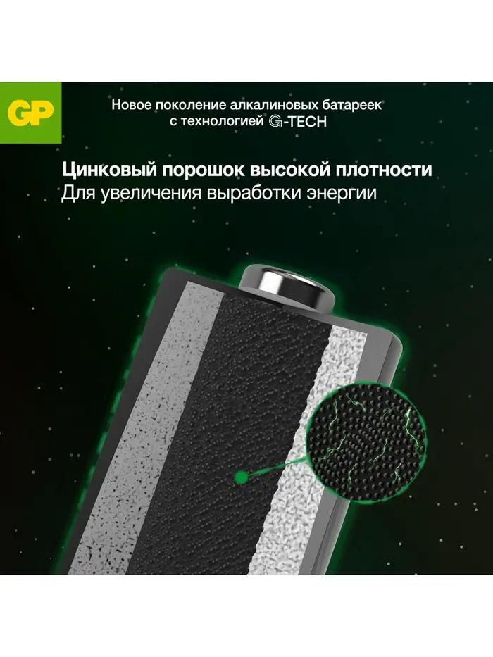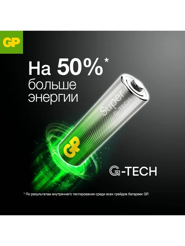 Познакомьтесь с новой линейкой батареек GP Super Alkaline с технологией G-TECH, которые обеспечивают до 50%* больше мощности, позволяя вам наслаждаться использованием ваших устройств без перерывов. Технология G-TECH гарантирует длительное время службы ваших устройств. Благодаря использованию графита высокой чистоты и высококачественного порошка цинка S, батарейки обеспечивают высокую мощность и стабильное напряжение на протяжении продолжительного времени. Запатентованная система предотвращения протечек обеспечивает безопасность использования и защиту ваших устройств. Эти щелочные батарейки выделяются соотношением цены и качества и идеально подходят для повседневных устройств, таких как часы, пульты дистанционного управления и другие. Выберите батарейки GP Super Alkaline с технологией G-TECH для надежной работы ваших устройств.