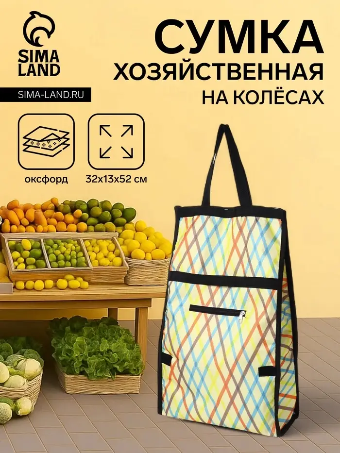 Сумка тележка хозяйственная, складная, на липучке, 2 колеса, наружный карман, 32×13×52 см, разноцветная