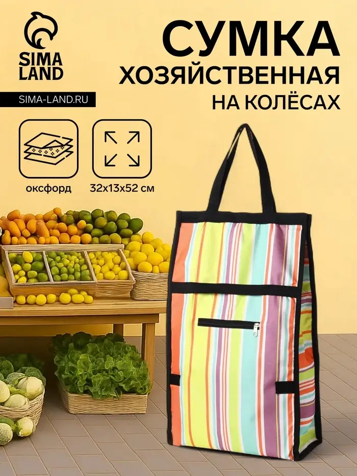 Сумка тележка хозяйственная, складная, на липучке, 2 колеса, наружный карман, 32×13×52 см, разноцветная