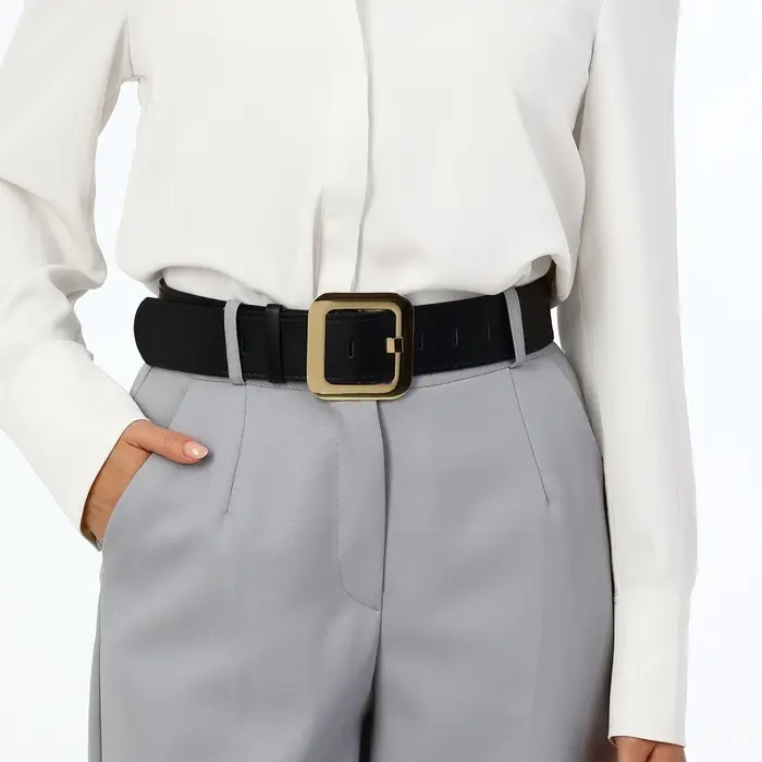 Этот широкий ремень с квадратной пряжкой создаёт выразительный акцент, который становится основой вашего образа. Чёрный цвет и золотистая фурнитура образуют сдержанный контраст, а геометричная форма добавляет современное звучание. Он лежит уверенно по талии, подчёркивая силуэт и сохраняя комфорт даже при длительной носке.