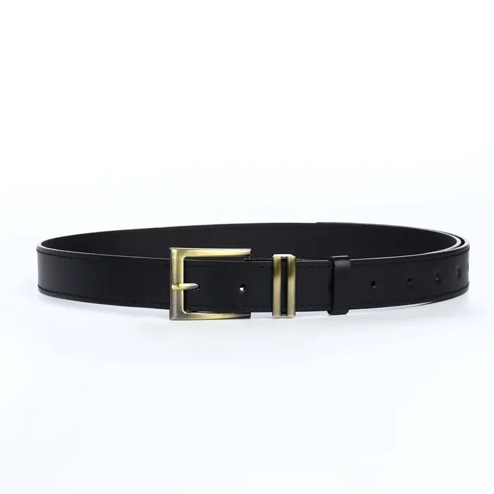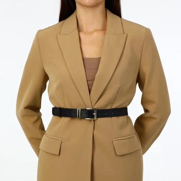 Чёрный ремень с золотистой пряжкой работает как связующее звено между обувью, сумкой и украшениями, создавая целостный и продуманный стиль. Его лаконичный дизайн уместен в офисе, на встрече или в повседневной носке.
