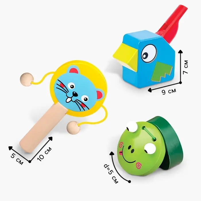 Набор «Музыкальные открытия» — это комплект из трёх деревянных инструментов, которые помогают детям от 3 лет погружаться в мир звуков и ритма. В набор входят свисток, кастаньета и колотушка, созданные из дерева. Эти инструменты не только радуют малышей своими звуками, но и способствуют развитию музыкального слуха, координации движений и воображения.