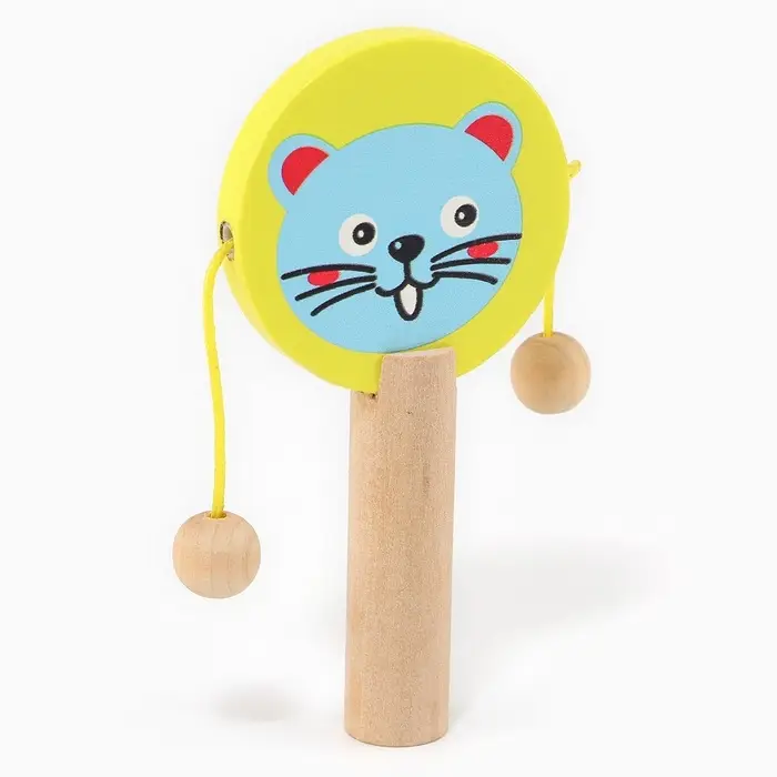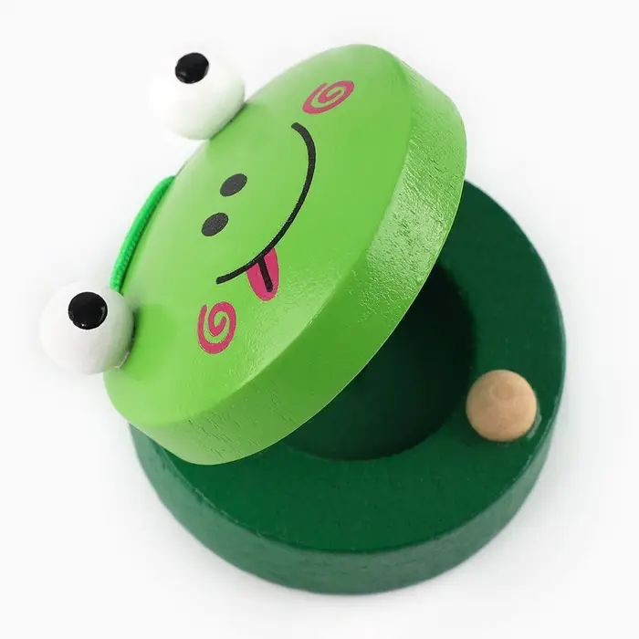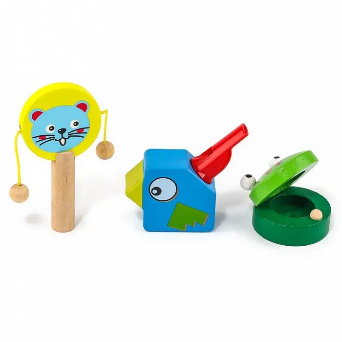 - Предложите ребёнку попробовать каждый инструмент: подуть в свисток, похлопать кастаньетой или ударить колотушкой. Это развивает слуховое восприятие и чувство ритма.
