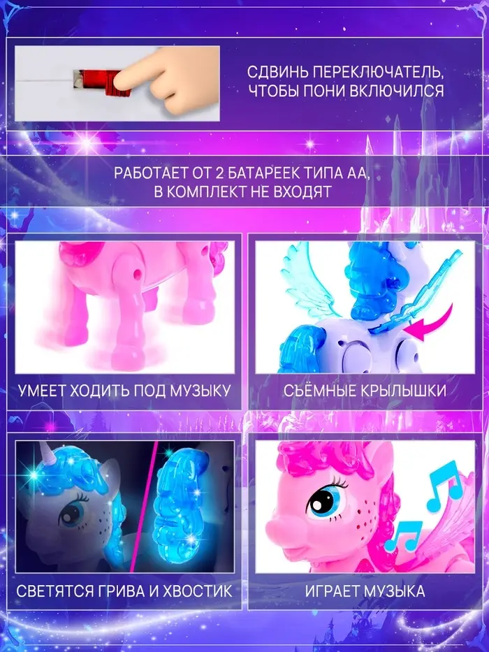 - Малышка сможет наблюдать, как единорог двигается под музыку, а её грива и хвостик мерцают яркими огоньками. Это создаёт волшебную атмосферу, будто пони прилетела из сказочного мира.
