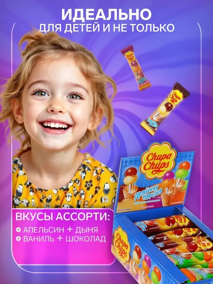 Карамель Chupa Chups "Двойная порция" — это настоящее наслаждение для любителей сладкого! Каждая карамель — это удивительное сочетание различных вкусов, которые создают яркую вкусовую палитру и порадуют даже самых взыскательных сладкоежек.