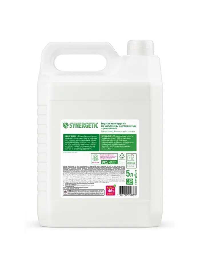 Средство для мытья посуды Synergetic, антибактериальный гель, биоразлагаемый, алоэ вера, 5 л