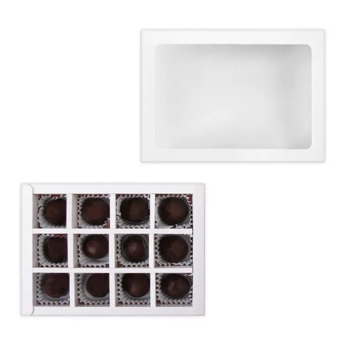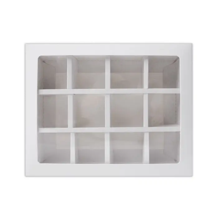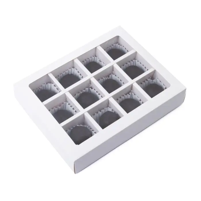 - Идеальная компоновка в 12 ячеек: Четкие внутренние перегородки формируют 12 одинаковых отделений. Это позволяет создать аккуратный, симметричный набор, где каждая конфета или трюфель представлены в выгодном свете.