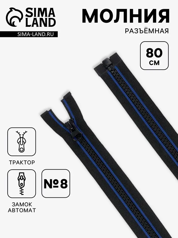 Молния «Трактор», №8, разъёмная, замок автомат, 80 см, чёрная, синяя