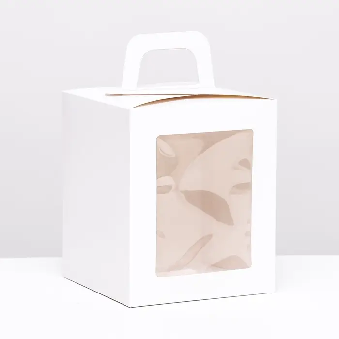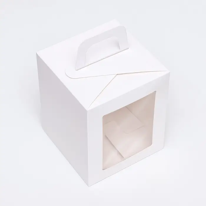 Белая кондитерская коробка с окном для десертов — это элегантная упаковка для торжественных и сложных десертов. Её высокие стенки и прозрачное окно создают эффект драгоценной витрины для кулинарного шедевра.