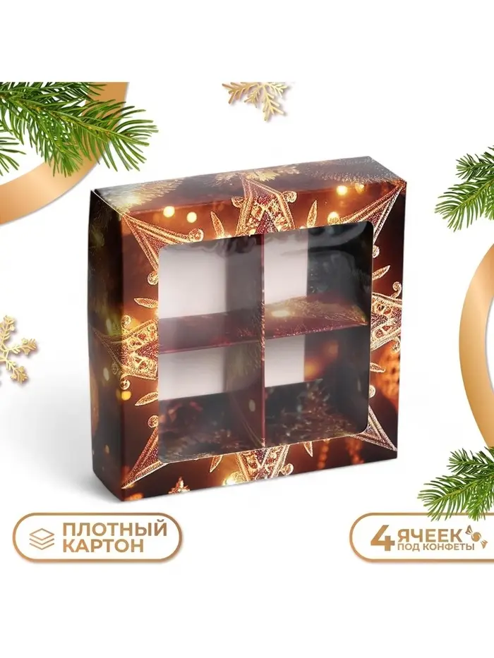 Коробка под 4 конфеты "Новогодняя" размером 12,6 х 12,6 х 3,6 см - это прекрасный выбор для упаковки сладостей к празднику. Она выполнена в ярких новогодних цветах, что создает атмосферу праздника и волшебства.