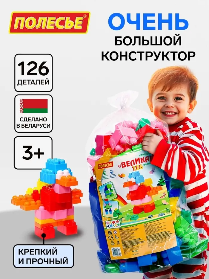 - Крупные детали – удобный формат: В комплекте 126 объемных элементов, которые удобно держать в руках. Крупные детали облегчают процесс сборки, делая его доступным даже для самых маленьких.