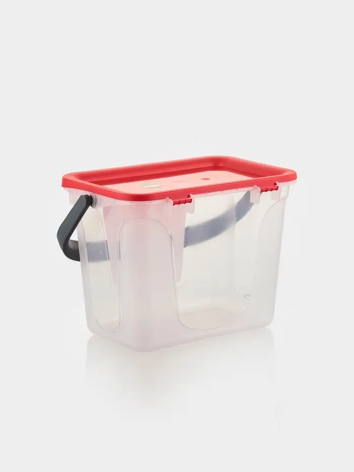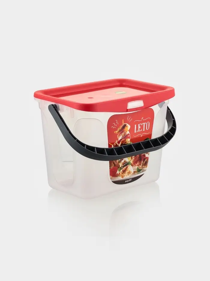 Вместительный контейнер с ручкой – ваш надежный помощник для транспортировки больших объемов продуктов! Этот 6-литровый прозрачный пластиковый универсальный контейнер с красной крышкой от "BEROSSI" облегчит перевозку шашлыка, солений или других запасов на пикник, дачу или в поездку.