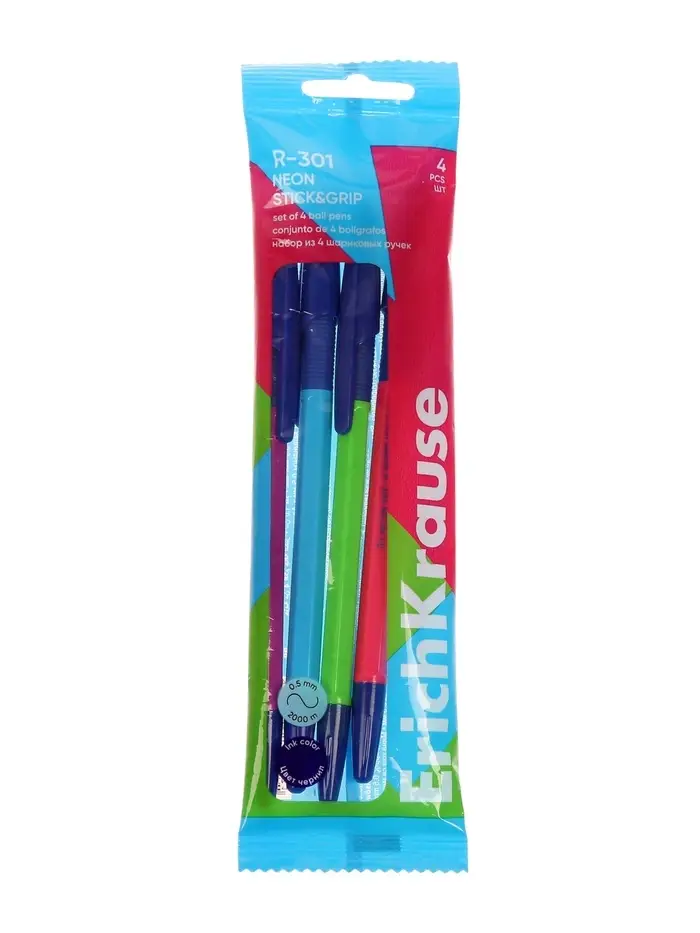 Набор ручек шариковых 4 штуки ErichKrause R=301 Neon Stick & Grip, узел 1.0 мм, чернила синие, резиновый упор, европодвес