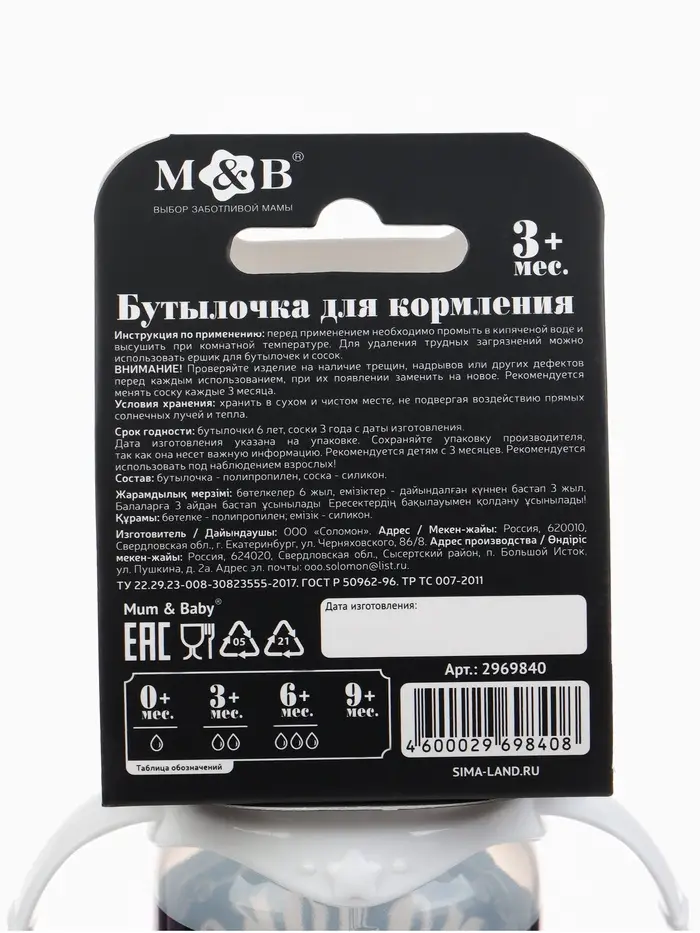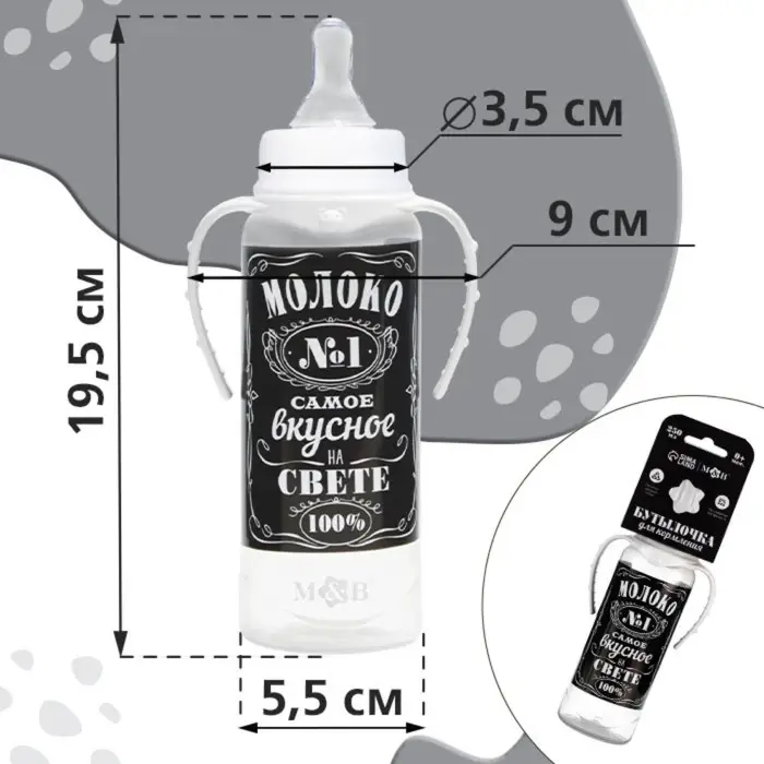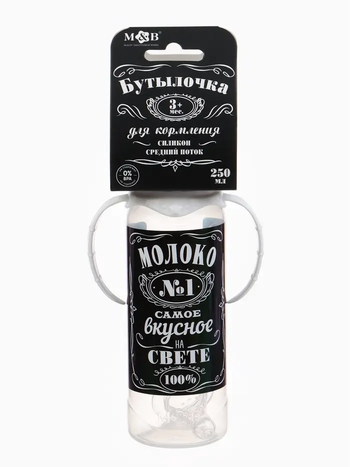 Бутылочка для кормления малыша M&B «Молоко № 1», классическое горло, с ручками, от 3 мес., 250 мл., чёрная
