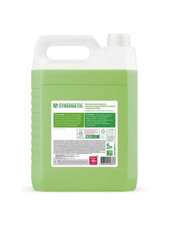 Средство для мытья посуды Synergetic, антибактериальный гель, биоразлагаемый, яблоко, 5 л