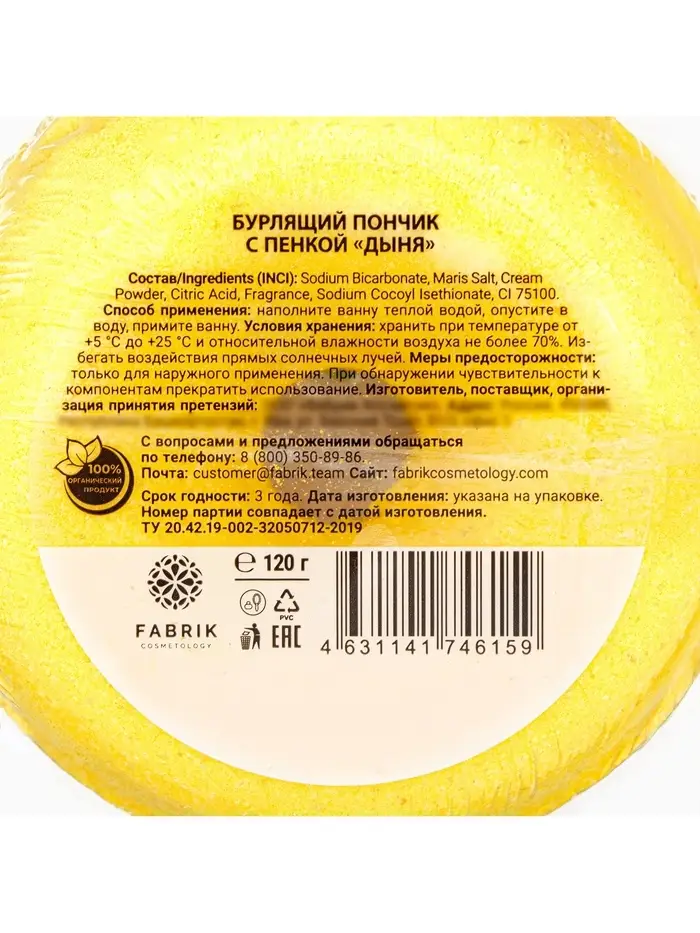 Бомбочка для ванн Fabrik Cosmetology с пенкой, дыня, 120 г