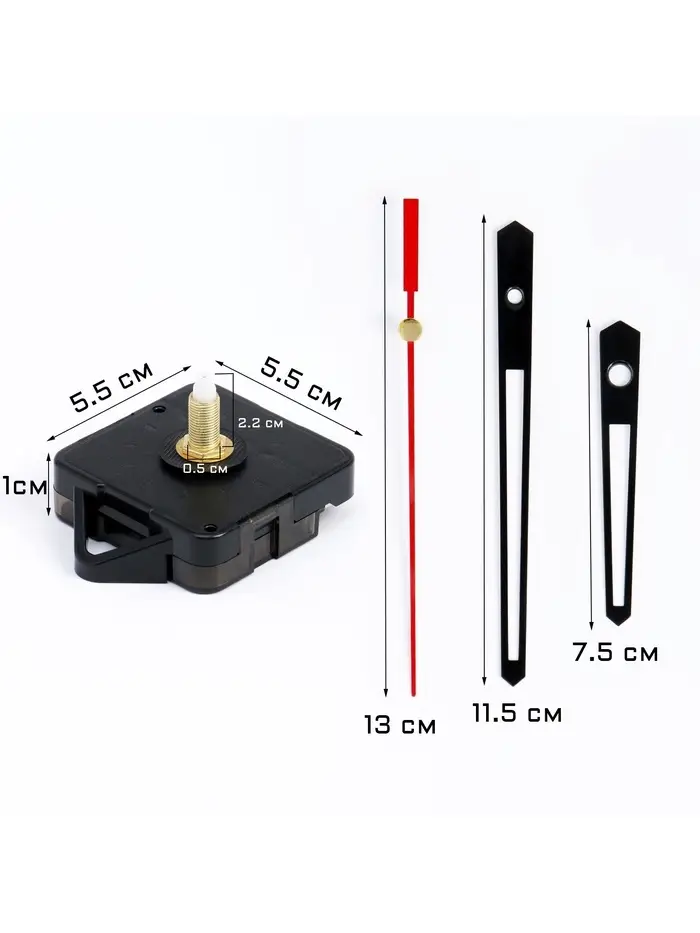 - Оптимальные размеры стрелок: часовая — 62 мм, минутная — 95 мм, секундная — 98 мм, что подходит для большинства настенных и настольных часов.
