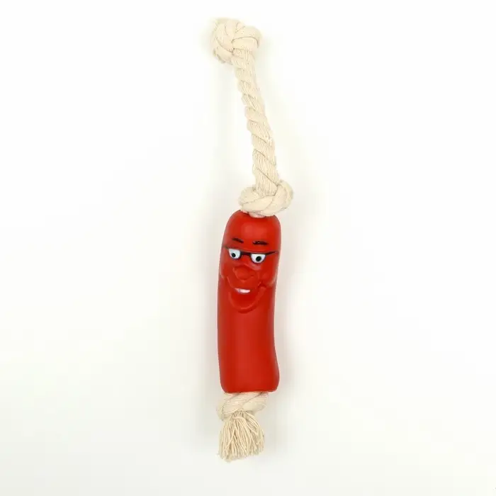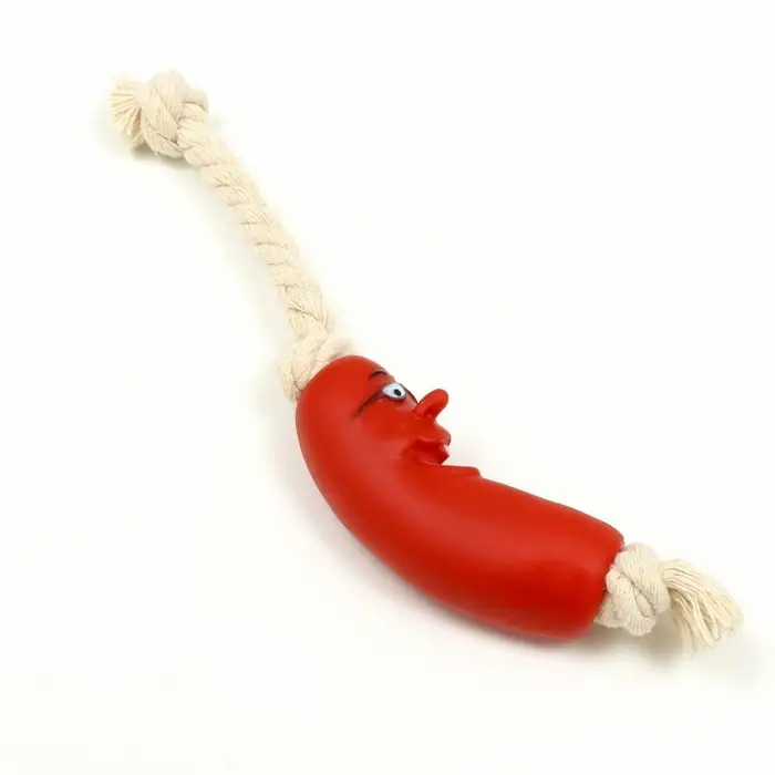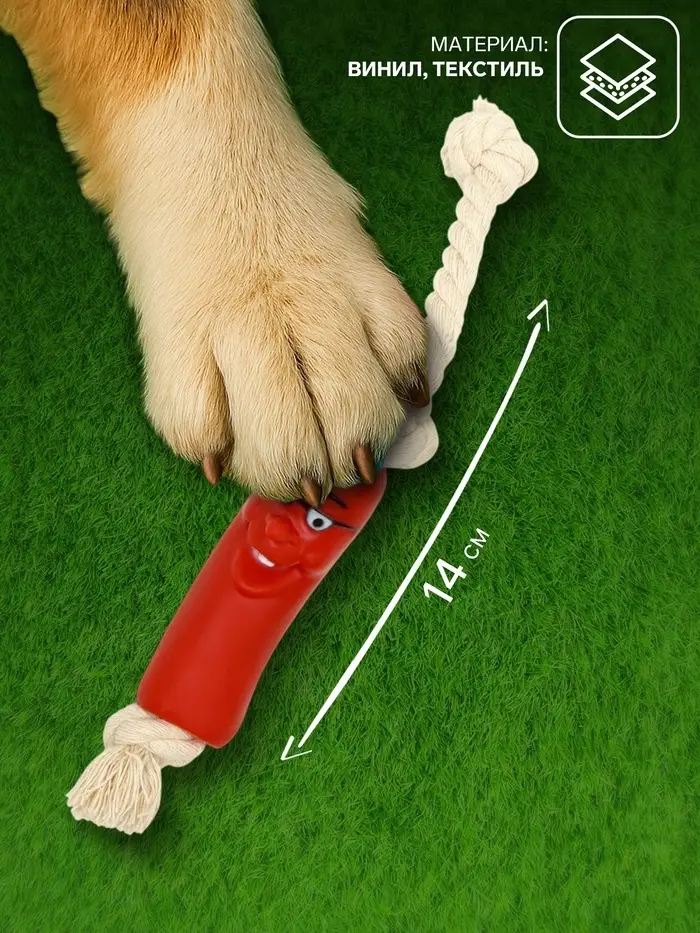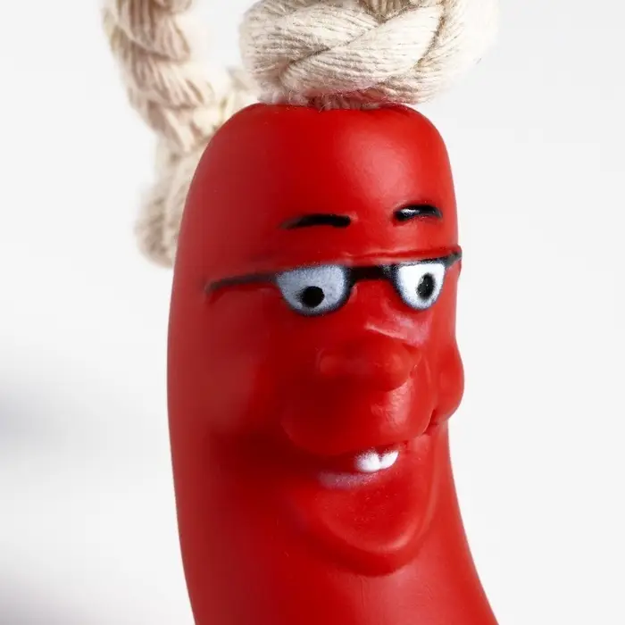 Игрушка для собак «Сосиска в очках на верёвке», 14 см, винил, красная
