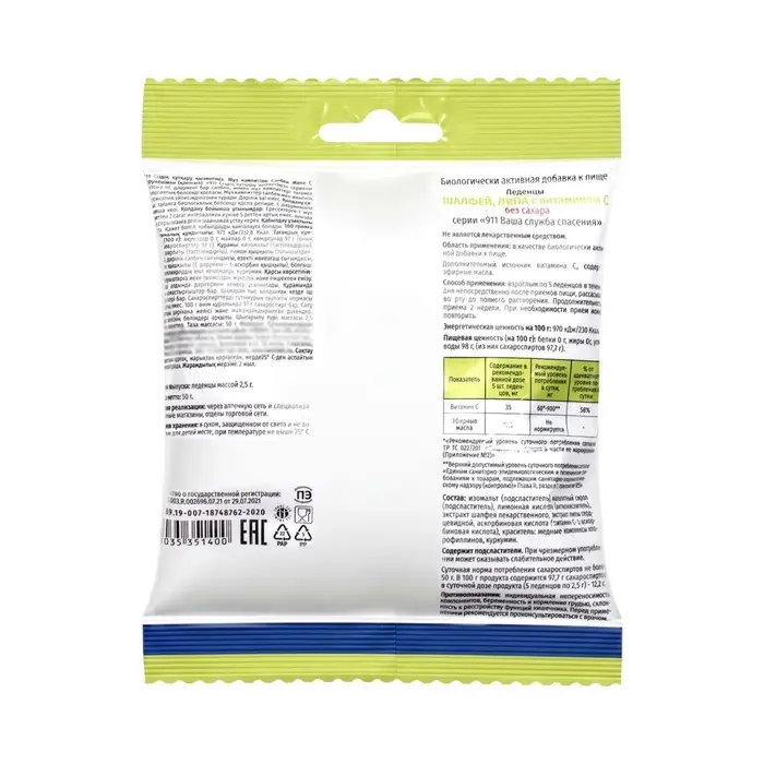 Леденцы 911 без сахара, шалфей, липа, витамин С, 50 г
