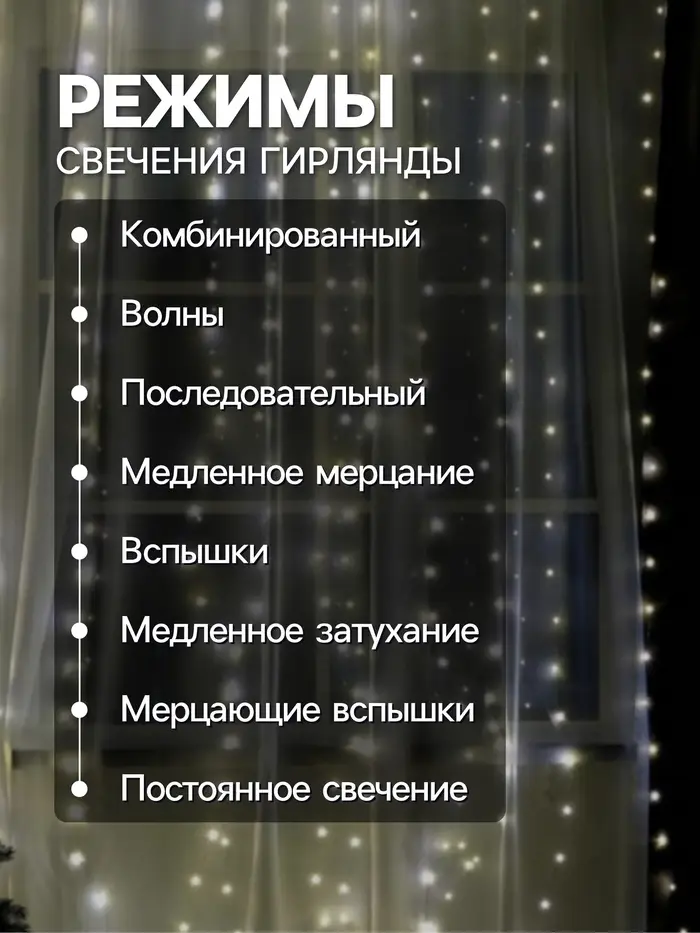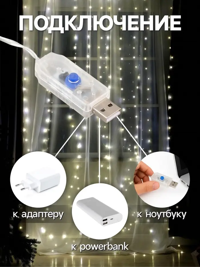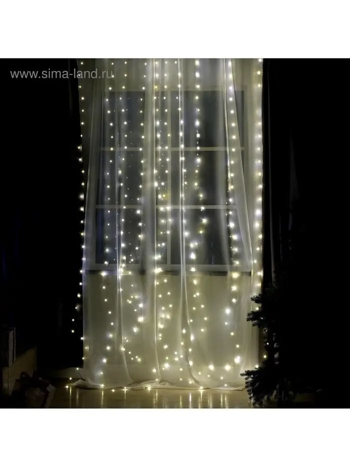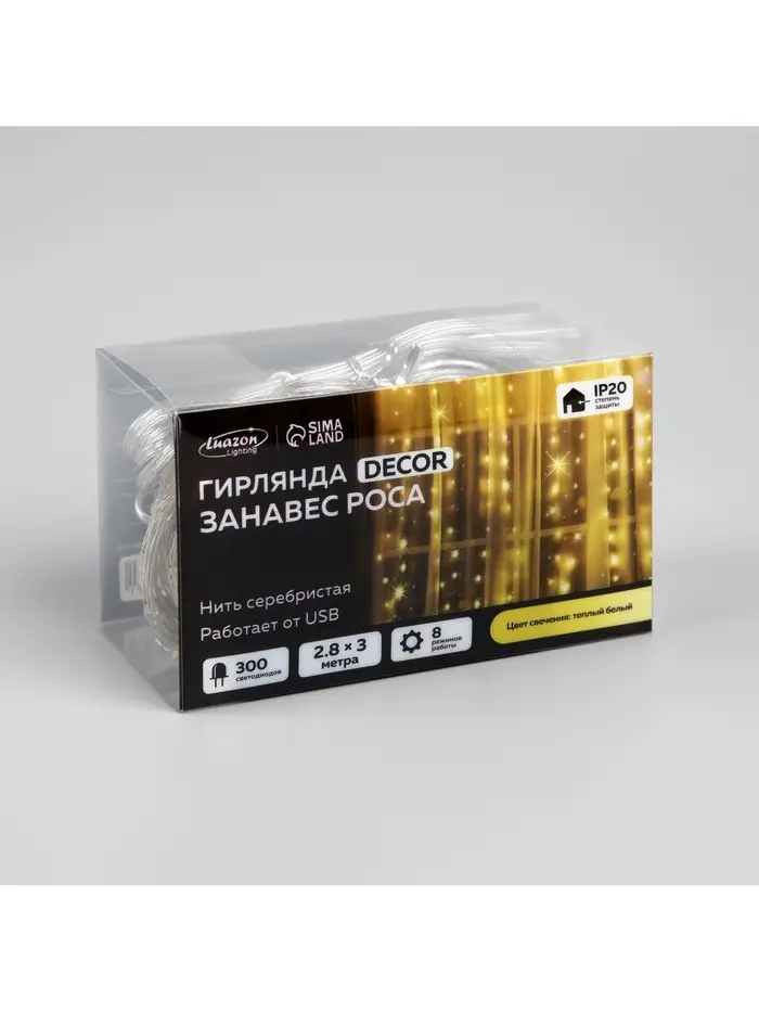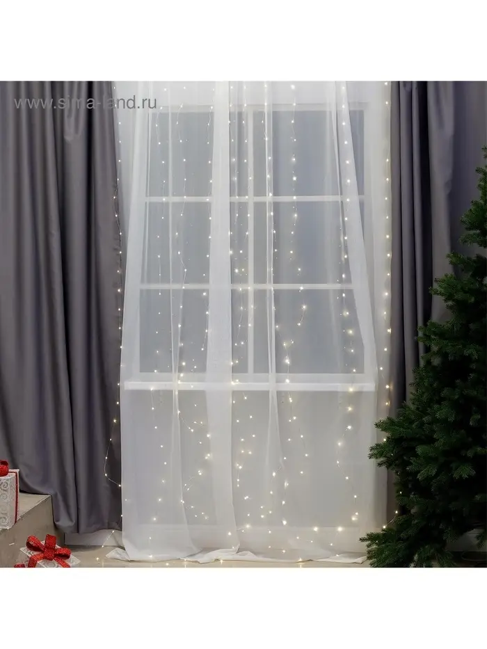 Гирлянда «Занавес» 2.8×3 м, роса на крючках, с пультом, IP20, серебристая нить, 300 LED, свечение тёплое белое, 8 режимов, USB
