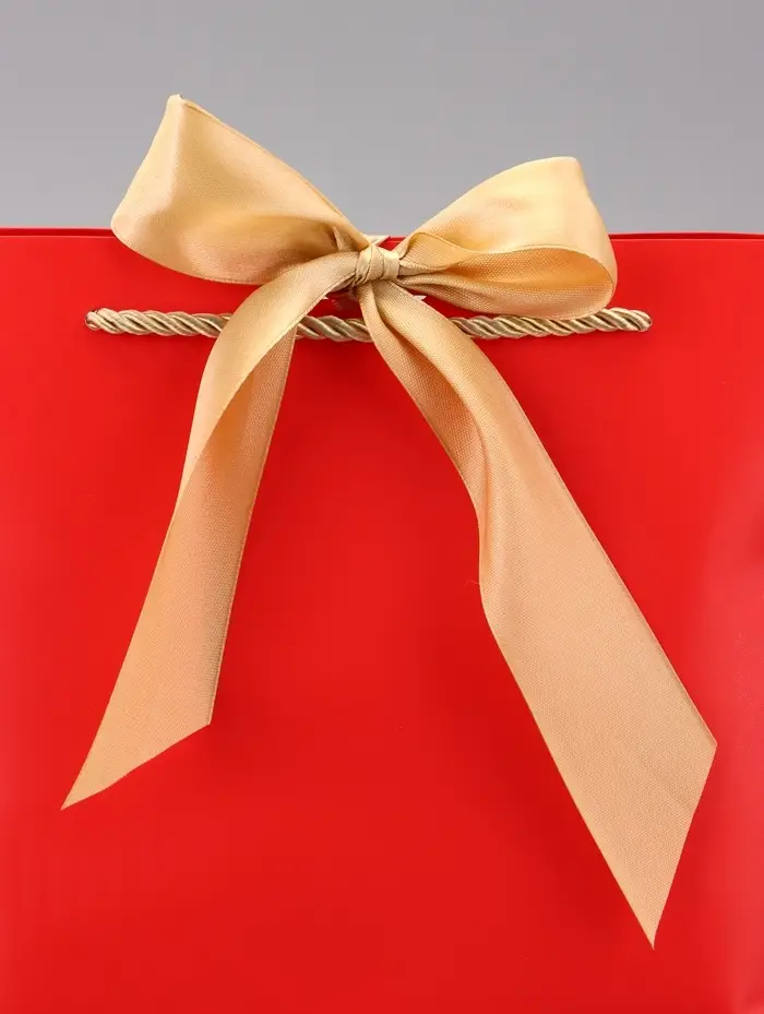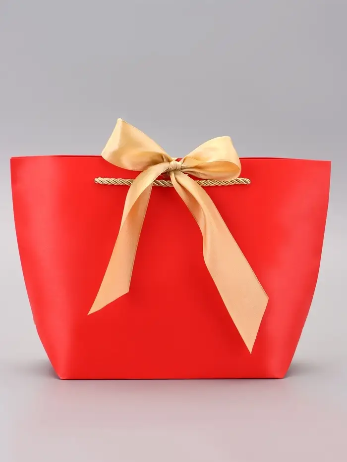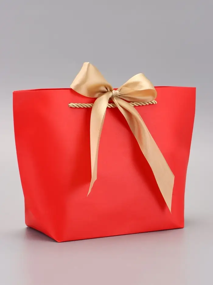 - Контрастные канатные ручки: Текстильные ручки создают выразительный акцент на фоне красной бумаги. Обеспечивают удобную переноску без дискомфорта для рук.