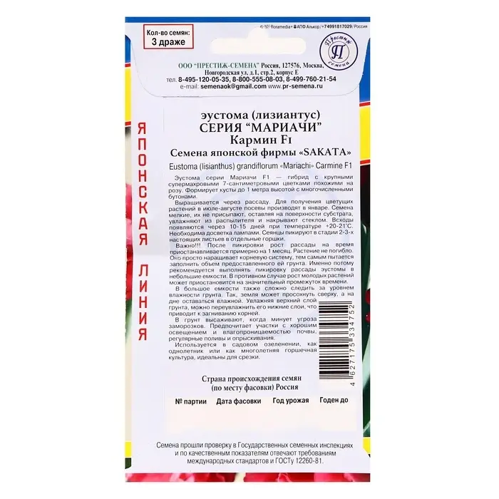 Семена цветов Эустома "Мариачи Мисти Кармин", F1, драже, 3шт