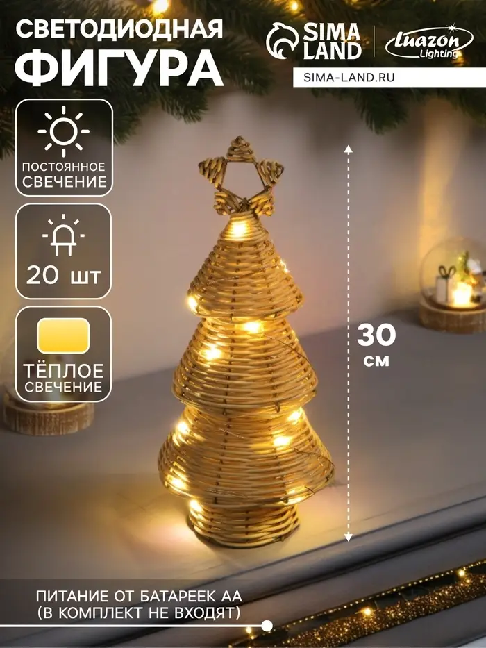 Светодиодная фигура «Ёлочка плетёная», 30×13×13 см, 20 LED, от батареек ААх2, свечение тёплое белое