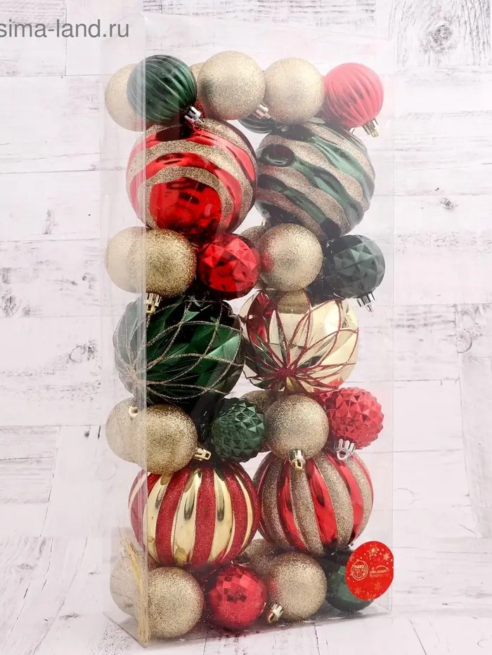 - Комплектация — 38 шт., достаточно для полного украшения даже самой большой ёлки.
