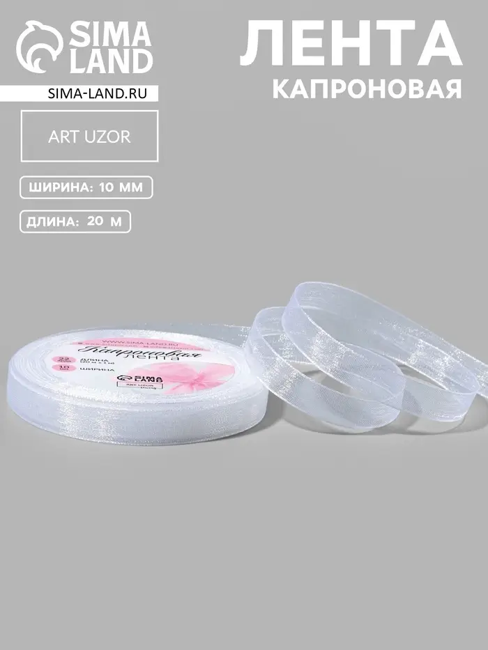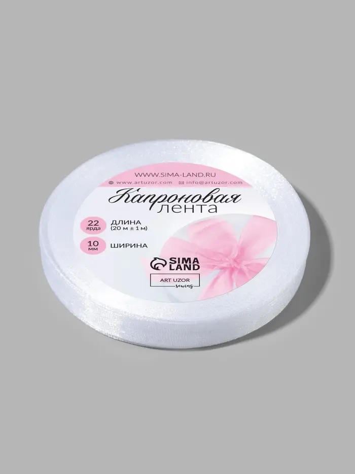 Узкая капроновая лента белого цвета подходит для деликатного декорирования. Длина 20 метров позволяет использовать материал в нескольких проектах.