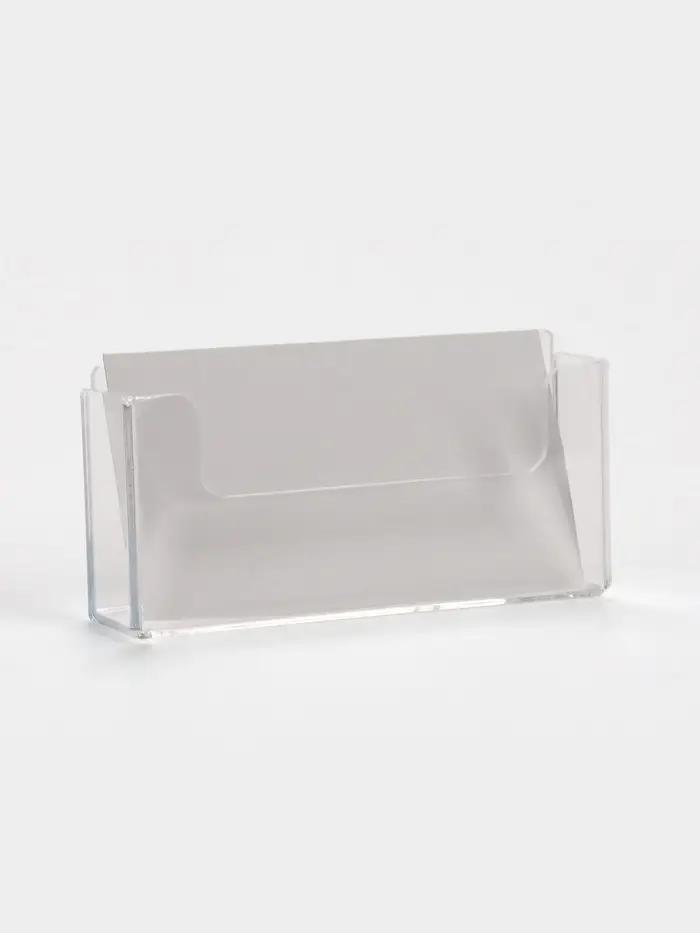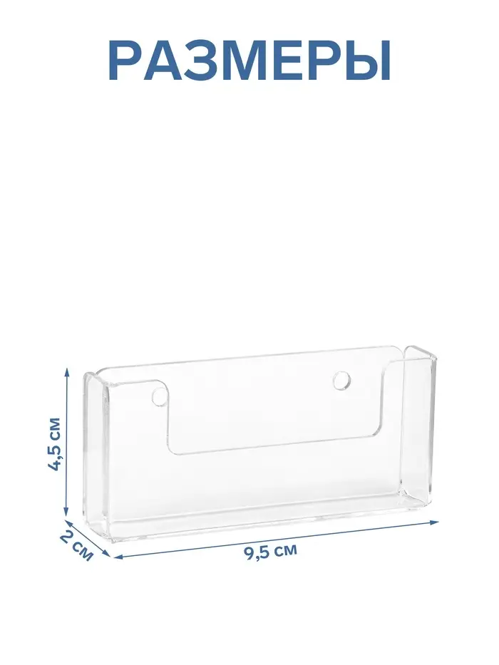 Настенная подставка для визиток размером 9,5×2×4,5 см из прозрачного оргстекла — это идеальное решение для аккуратного хранения и презентации визиток. Компактный размер и практичный дизайн делают её удобной для использования в офисах, на стойках ресепшн и в торговых залах. Прозрачное оргстекло подчёркивает стильный вид изделия и обеспечивает лёгкий доступ к визитным карточкам. Подставки из оргстекла (листовой акрил). Благодаря использованию 100% акрила, подставки имеют идеальную прозрачность, высочайший блеск и шикарный внешний вид. ВНИМАНИЕ: Изделия поставляются в матовой защитной плёнке, белого, синего, зелёного или прозрачного цвета, которую необходимо удалить перед оценкой качества или перед использованием.