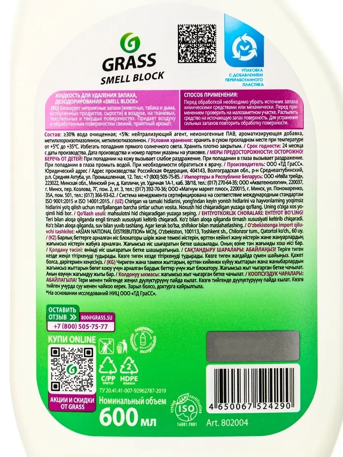 Формула Smell Block работает не просто как маскировка запаха, а активно нейтрализует источники неприятного аромата, создавая свежую и чистую атмосферу. Средство безопасно для человека и домашних животных при соблюдении инструкции.