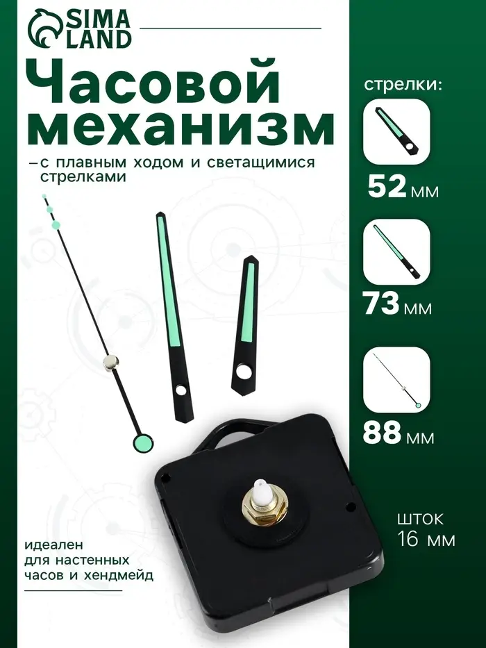 Часовой механизм со стрелками «Соломон-10», плавный ход, шток 16 мм, стрелки 52/73/88 мм, светящиеся